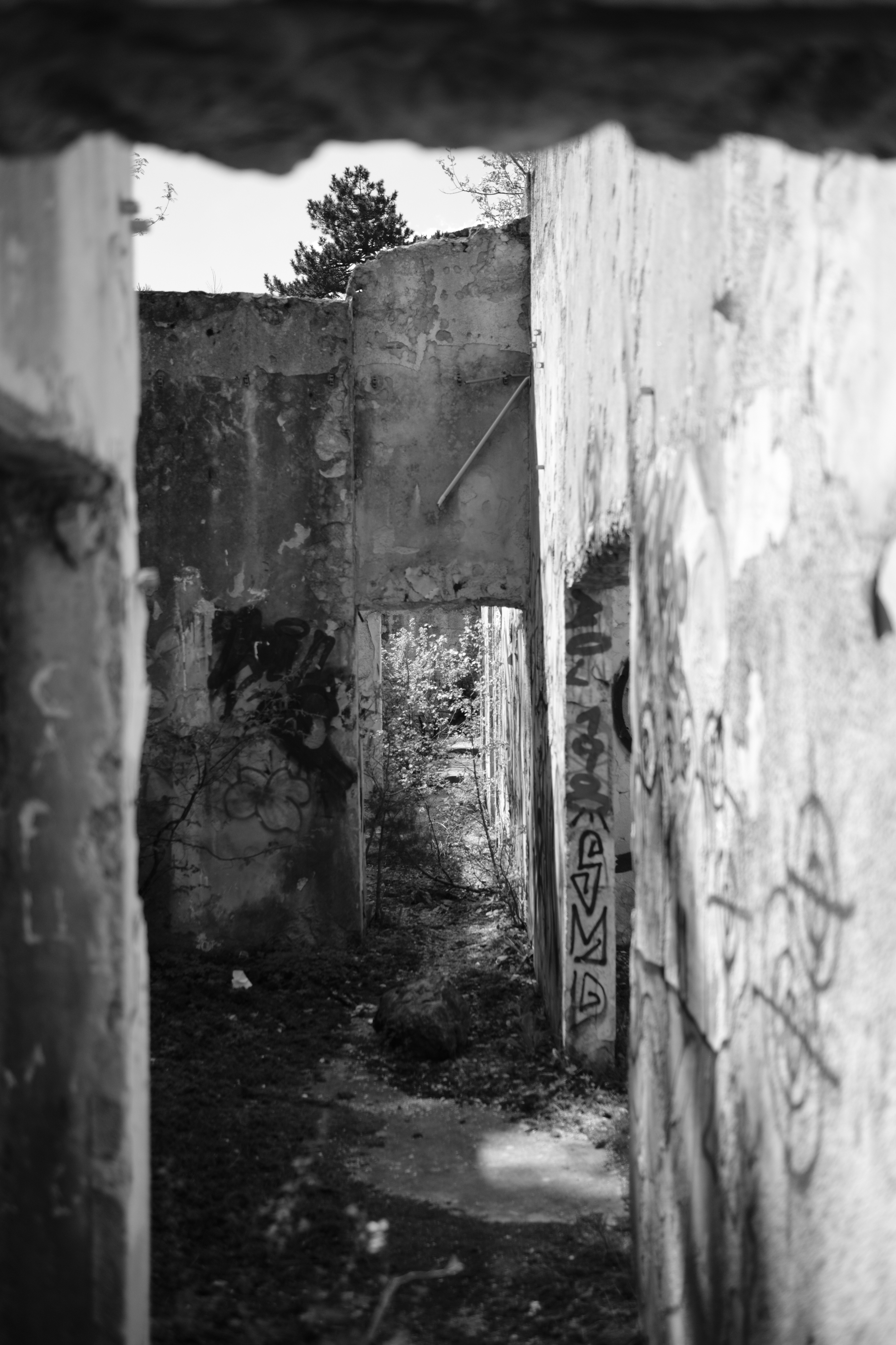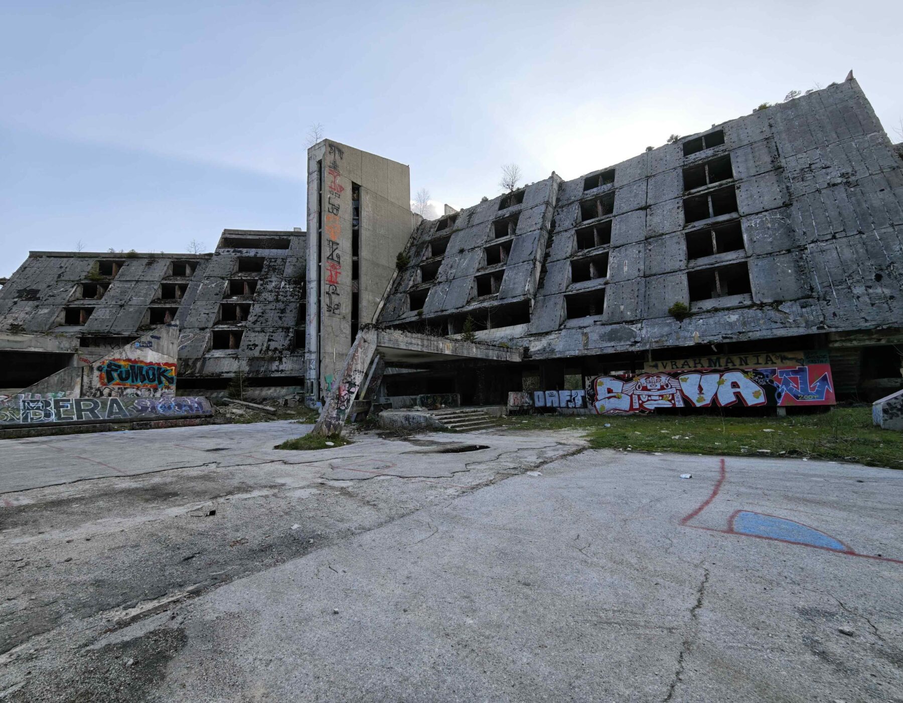 Oben habe ich der TripAdvisor-Rezensentin unterstellt, das Konzept der Lost Places nicht verstanden zu haben. Allerdings muss ich gestehen, daß ich hier auch das meinige etwas in Zweifel ziehe. Bei meinem letzten Besuch hier fand ich das verfallene/ zerbombte Hotel auf dem Rückweg von der Bob-Bahn noch einen faszinierenden LP. Ich könnte wetten, wenn ich in meinem Lightroom-Archiv suche, fände ich dort bestimmt 100+ Bilder davon. Diesmal lies ich ihn, im wahrsten Sinne des Wortes, links liegen. Das hat mehrere Gründe: zum einen ist meine aktuelle Begleitung (noch) weniger LP-affin als meine damalige, zum anderen sind 200+ Bilder im Lightroom primär nur doppelt so viel wie 100+, nicht unbedingt aber doppelt so gut. Der Hauptgrund war aber, daß wir bei unserer Anreise durch Kroatien und Bosnien so viele Kriegs- und Bau-Ruinen gesehen haben, daß das Hotel für mich eigentlich nur ein Haufen kaputter, beschmierter und zugemüllter Steine war.