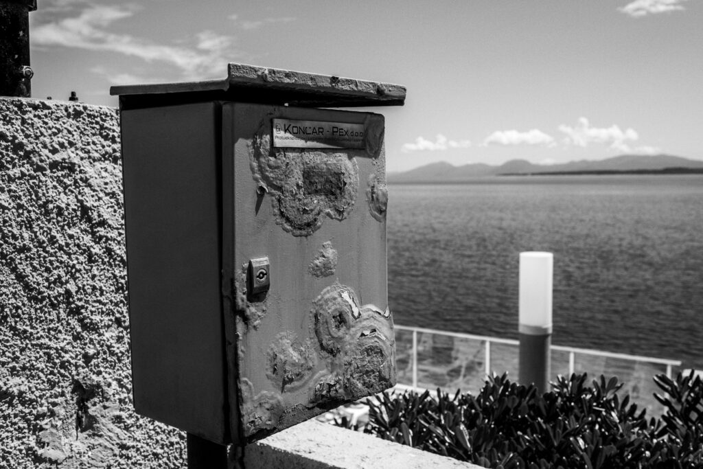 Das Konzept eines Lost Places ist, zumindest meinem Verständnis nach, daß er einmal nicht lost war. Wenn ich z.B. das Nobel-Hotel bei der Groß-Schanze google, finde ich dort Myriaden von Bildern, deren Fotograph das Glück hatte, daß ihm die Decke nicht auf den Kopf gefallen ist. Oder er sich, durch ein Loch in selbiger, spontan ein paar Etagen tiefer wiederfand. Dazu Filme, Drohnenüberflüge und keine Ahnung noch was (eine ordentliche Aufzählung benötigt nun mal 3 Punkte). Ich reihe meine Bilder in dieses „Meer-vom-Gleichen“ (sic!) ein.