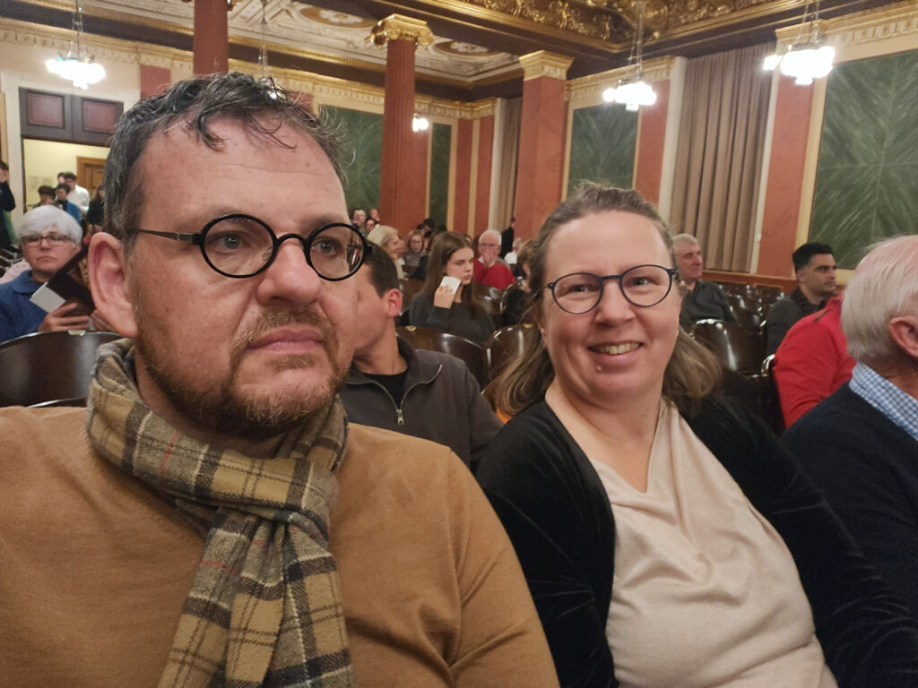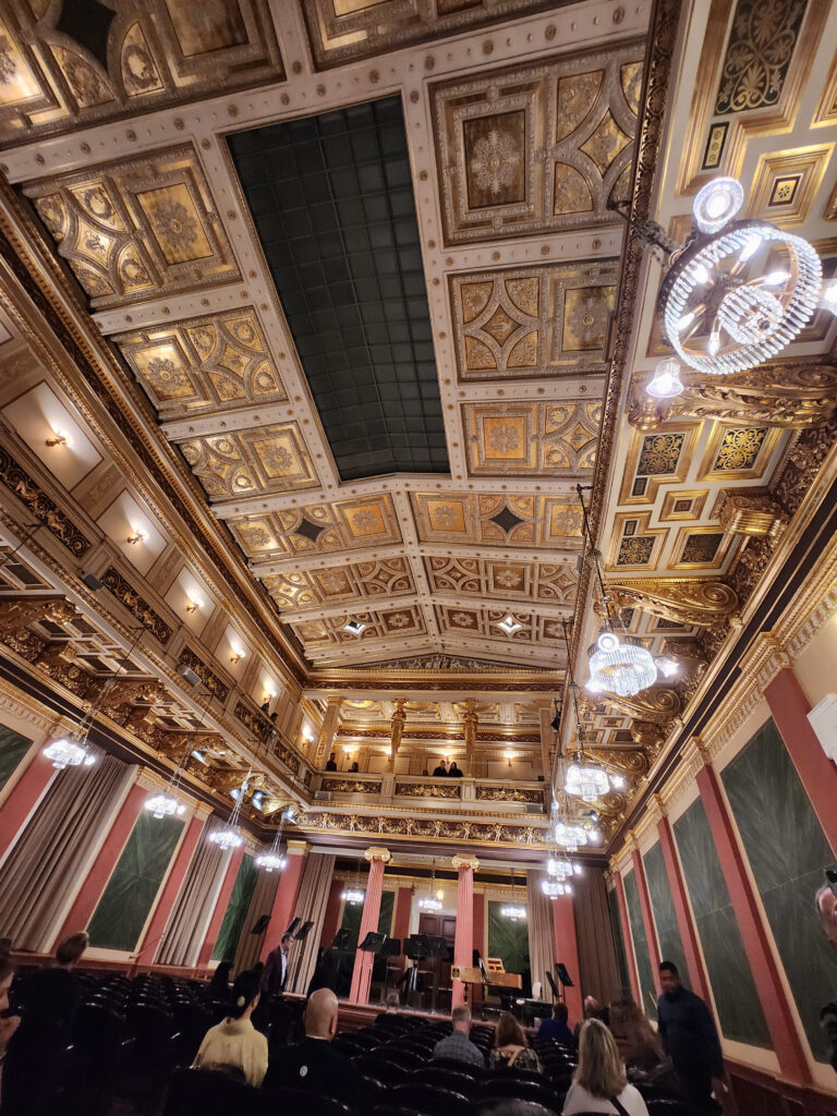 Unser Konzert fand im Brahms-Saal statt: Holzvertäfelung vom feinsten: goldene Intarsien, reich geschmückt und eng bestuhlt. Das Kammerorchester trat ohne Dirigenten auf, entsprechend übernahm der Konzertmeister, oder „Die erste Geige“ den Part des Einsatzgebens. Es war schön zu sehen, wie das gesamte Orchester sich auf ihn zentrierte. Im Laufe meines Lebens bin ich, glaube ich, ganz schön anspruchsvoll geworden, was klassische Musik anbelangt. So fällt mir extrem auf, wenn ein Orchester technisch gut spielt, es aber versäumt „miteinander zu musizieren“. In unserem Fall haben sie wunderbar miteinander musiziert: klanglich und rhythmisch gut aufeinander abgestimmt – sicht- und hörbar aufeinander bezogen. Das war eine Wohltat.