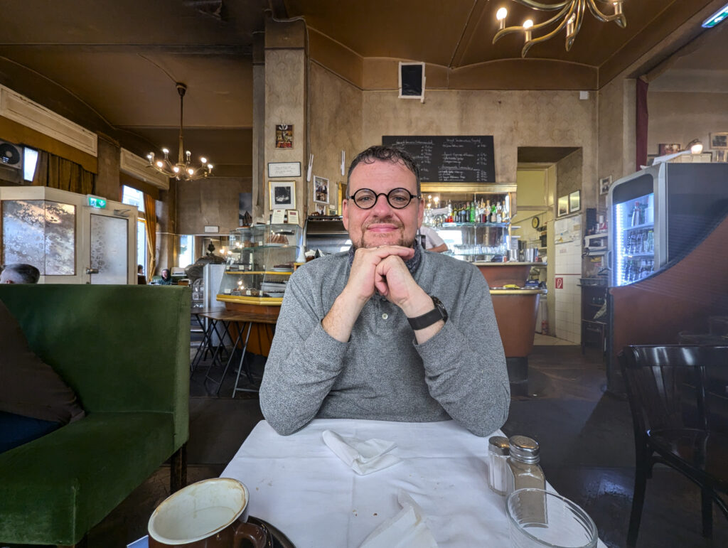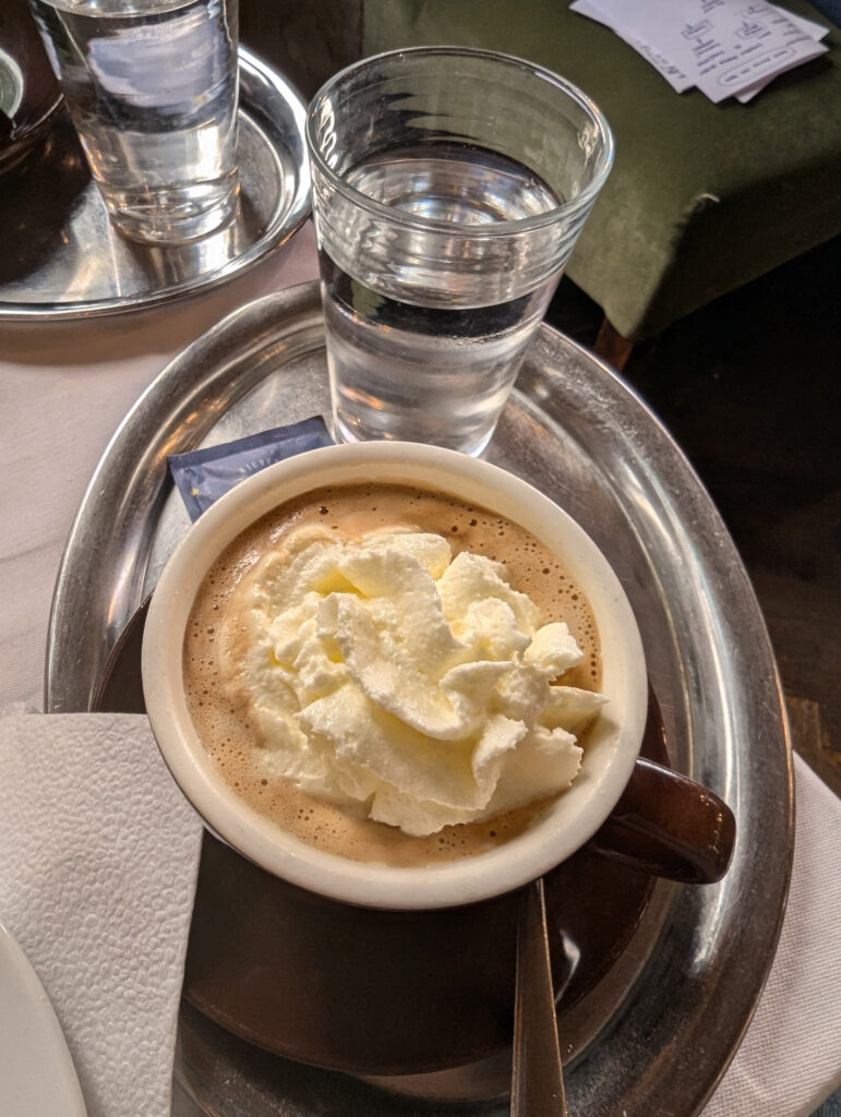 Auch ohne Torte macht sich doch ein gewisser Kaffeedurst bemerkbar. Kein Problem, schließlich sind wir in der Welthauptstadt der Kaffeehaus-Kultur. Ich muss zugeben, ich dachte bis heute, „Café Central“ sei der exklusive Name des Weinheimer Jugendtreffs. Aber irgendwie scheinen die Ösis den so toll gefunden zu haben, daß sie ihn direkt klauten. Und nicht nur die Ösis fanden den Namen toll, sondern scheinbar auch 1 Million Touristen: wenn die Schlange vorm Sacher schon megalang war, war sie hier gigalang. Haben die alle kein zuhause? Nicht verzagen, Google fragen. Je nach gewähltem Ergebnis das erst- oder zweitbeste Kaffeehaus der Stadt ist das Café Jelinek. Vorteil: es liegt ziemlich weit ab von (touristischen) Schuss, so daß sich Busladungen von Reisenden*innen dort eher selten einfinden. Nachteil: es liegt ziemlich weit ab vom Schuss.