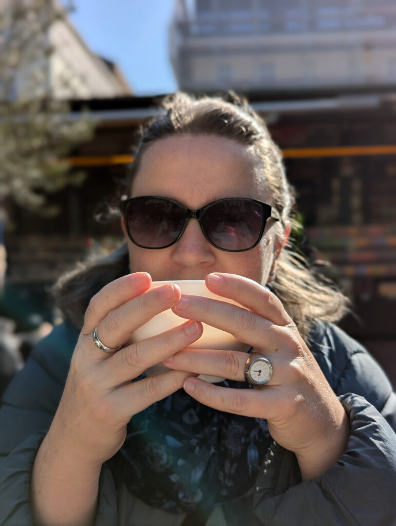 An dieser Stelle passt folgende Exkursion ganz gut, denke ich: ein Freund (M. aus M.) meinte, als er mitbekommen hat, daß wir nach Wien fahren, daß er die Stadt als hoffnungslos überteuert erlebt hat. Natürlich ist Wien keine billige Stadt, aber wir haben uns in einer der vielen Naschmarkt-Gastronomien mit einem Croissant, einem Milchkaffee (mit Hafermilch, die kostet extra), einer großen Hopfenkaltschale und einer Linsen-Suppe gestärkt. Und das alles um 19 Euro. Die wärmende Sonne und das Kaiserwetter gab’s kostenlos obendrein. Wie gesagt, billig ist das nicht, aber „überteuert“ sicher noch weniger.