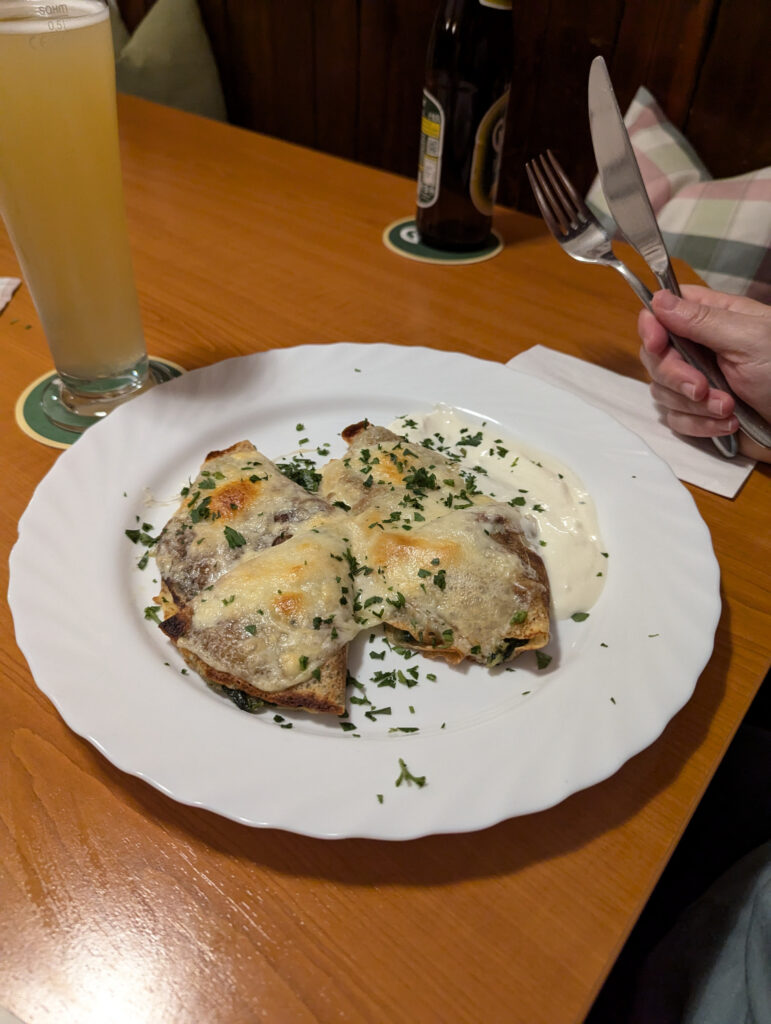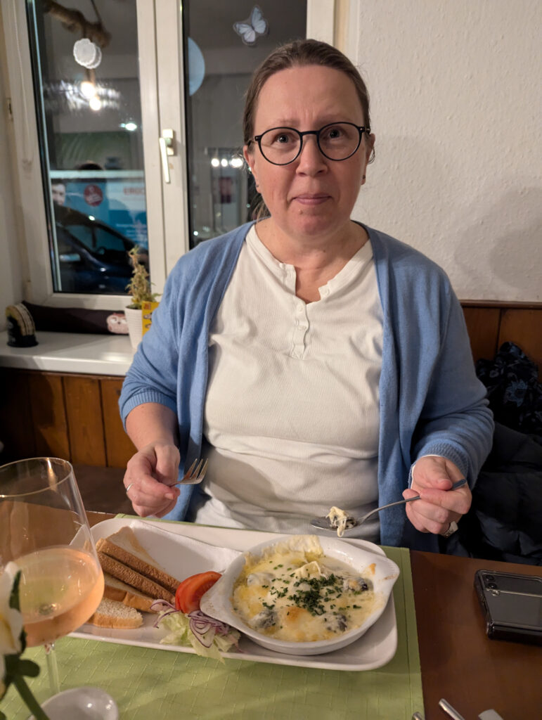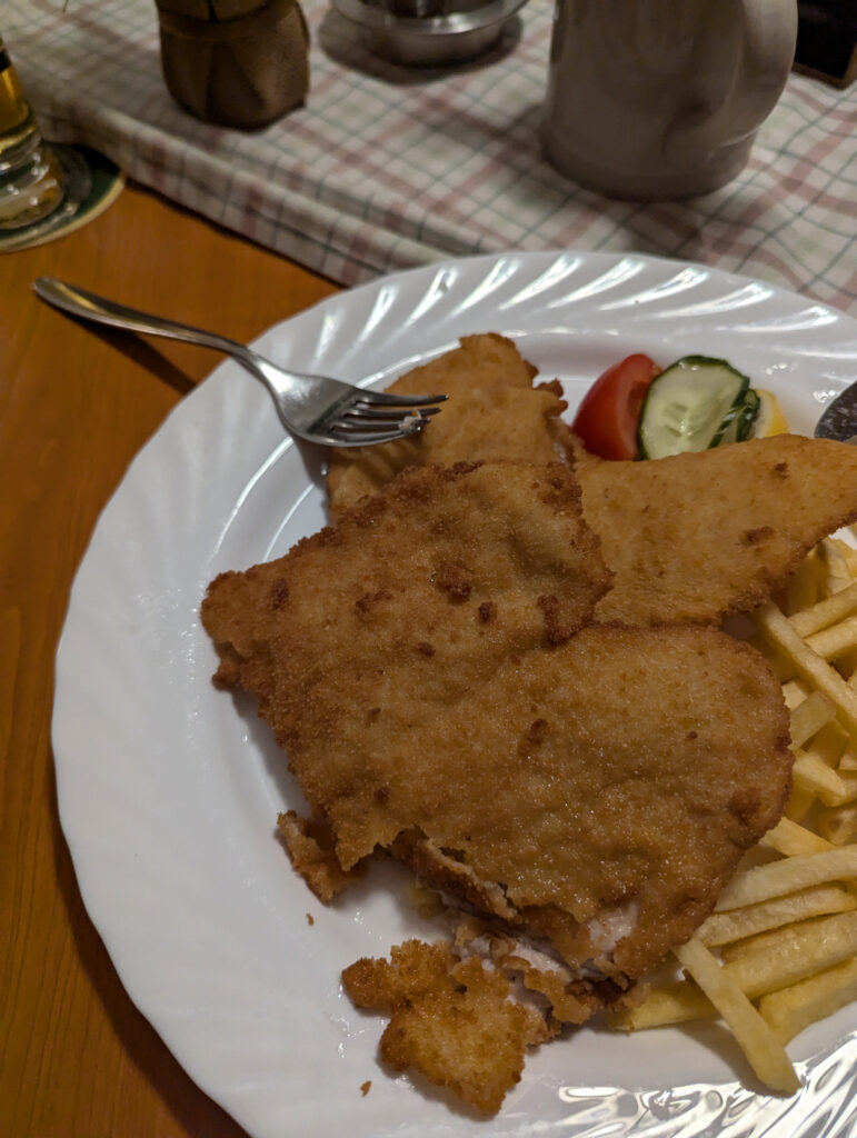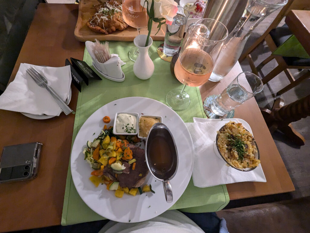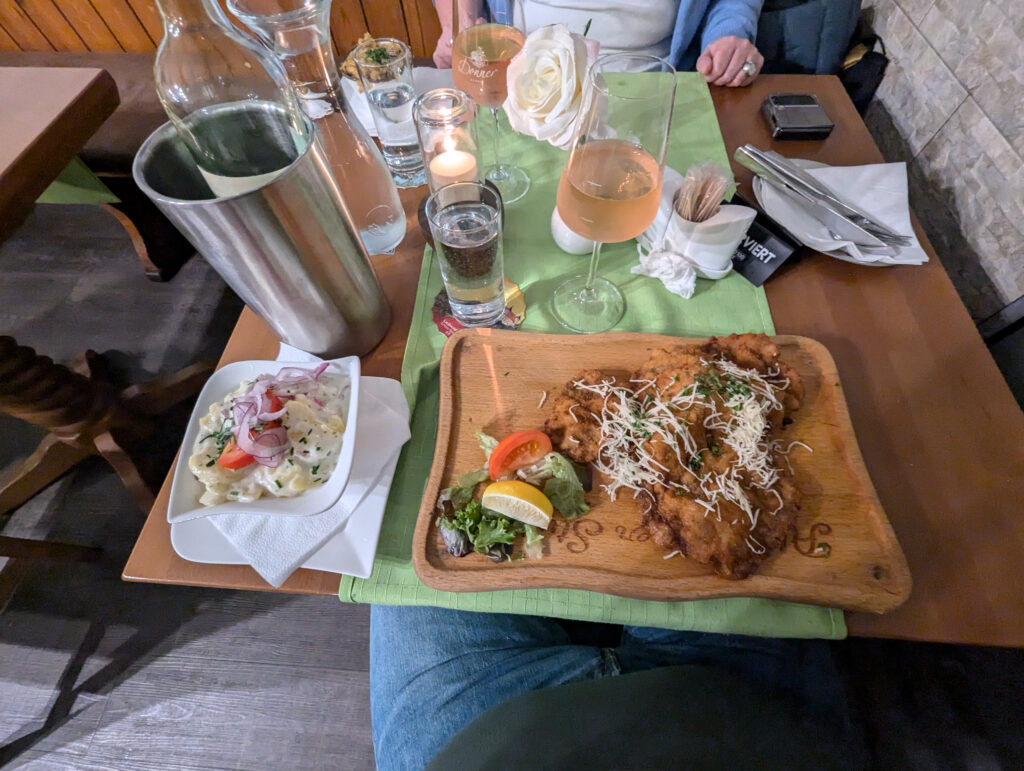Nachtrag: abends gingen wir dann noch zu einem ergoogelten Geheimtipp (ist das nicht an sich schon ein Paradoxon?) essen. Die Beschreibung lautete „lokales Essen, gute Portionen, authentische Atmosphäre“. Dem habe ich nichts hinzuzufügen, aber einiges zu untermauern: Schnitzel „Wiener Art“ vom Schwein (gibt es hier tatsächlich auch), für Birgit irgendwas vegetarisches, Getränke, Nachtisch – der Digestif ging auf’s Haus, weil ich (fast) richtig erraten habe, was für ein Brand das war (Pflaume oder Birne, das stört schließlich keinen großen Geist). 50 Euro. Überteuert ist definitiv anders.