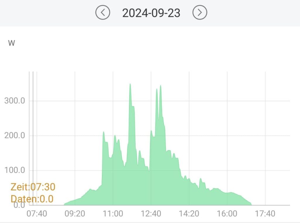 Auch hier sieht der Verlauf sehr „dynamisch“ aus und die Spitzen um die Mittagszeit wirken ähnlich imposant wie meine Abnehm-Kurve im vorherigen Beitrag. Das ganze relativiert sich, wenn man erkennt, daß die (sehr kurzzeitige) Peak-Leistung ziemlich genau 1/4 des Bedarfs meiner Kaffeemaschine (während des Aufheizens) decken würde. Oder aber daß die Gesamtarbeit des Tages eine monetäre Entlastung von ca. 18 Cent brächte, unter der Voraussetzung, daß jedes einzelne Watt direkt verbraucht wird und nicht ins Netz zurückfließt.
