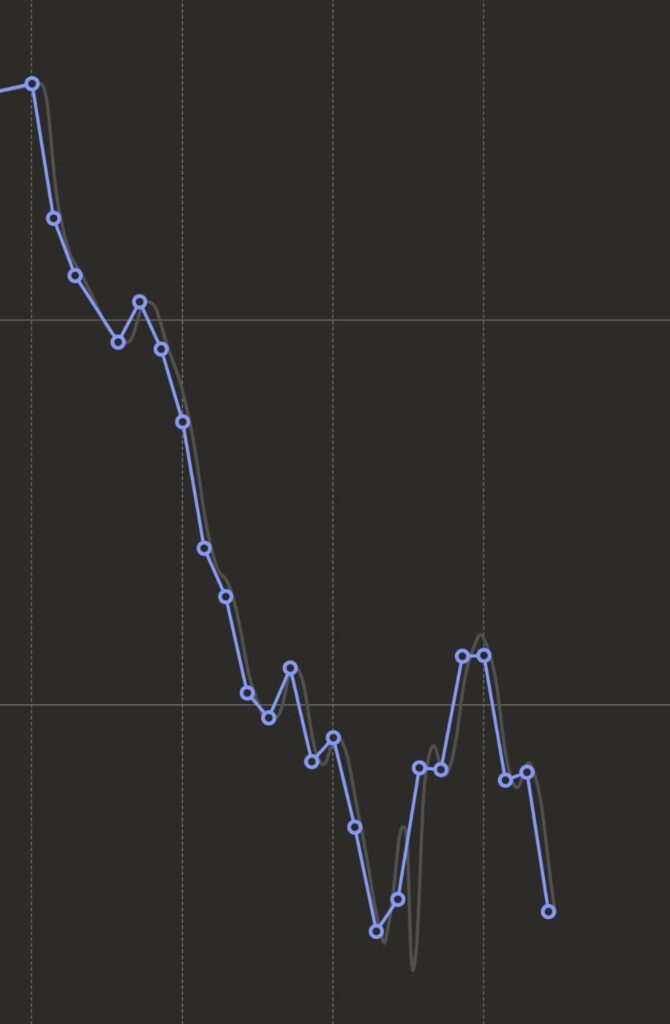 Fakten: die absoluten Werte der Ordinate werde ich, zum großen Teil aus Scham, hier nicht verraten. Aber zwischen 2 Linien liegen 2kg, d.h. zwischen dem Maximal- und Minimal-Wert liegen 3,6kg. Und zwischen den gestrichtelten Linien entlang der Abszisse liegen 1 Woche/ 7 Tage. (Der, relativ flache, lineare Verlauf vor dem ersten vertikalen Strich ist eine Interpolation meiner stetigen Gewichtszunahme der letzten Monate/ Jahre; ich habe in dieser Zeit die Waage gemieden wie … na, Ihr wisst schon ;- )